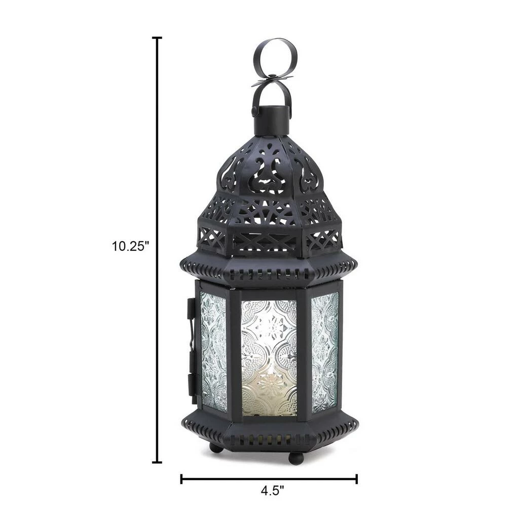 Either hanging or stationary, this Moroccan style candle lantern casts gorgeous light on any table spread and provides a warm glow on brisk nights. Its decorative metal top and etched glass lend an exotic flair to any home. The glass panel is easily opened to allow for new candles or LED lights to be placed inside and casts a flickering glow on summer and winter events alike.