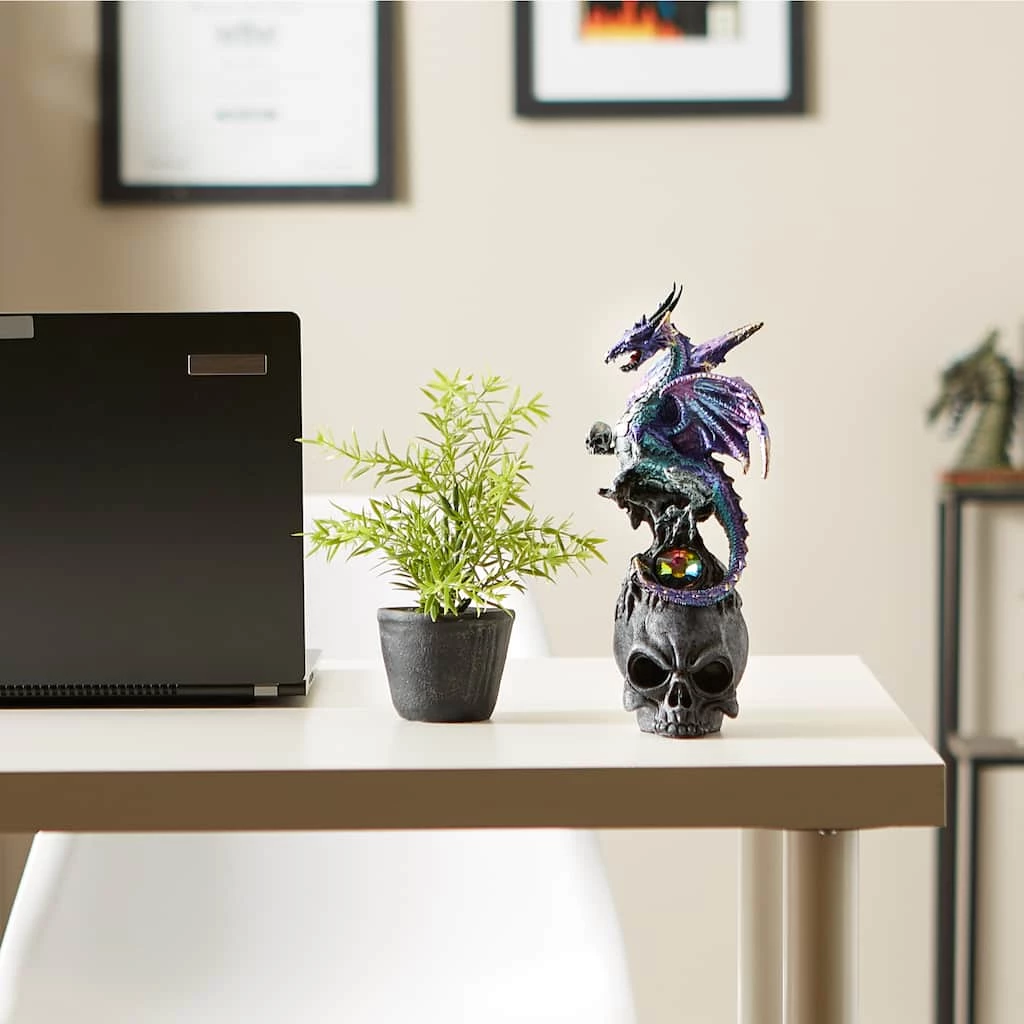 Made of durable and detailed polyresin that captures each fantastical facet. Use for a variety of purposes including bookshelf or room dΓ©cor, outdoor garden accents, D and D accoutrement, or as a fantastic gift. This figurine can be anything you imagine! To clean your mystical figurine dust lightly or wipe with damp cloth as needed. With a dazzling purple and aqua dragon is perched atop a skull, complete with a brilliant faceted jewel this piece is a must have for any fantasy lover. This mesmerizing dΓ©cor piece is an excellent gift and will look stunning perched on a shelf, desk, or table.