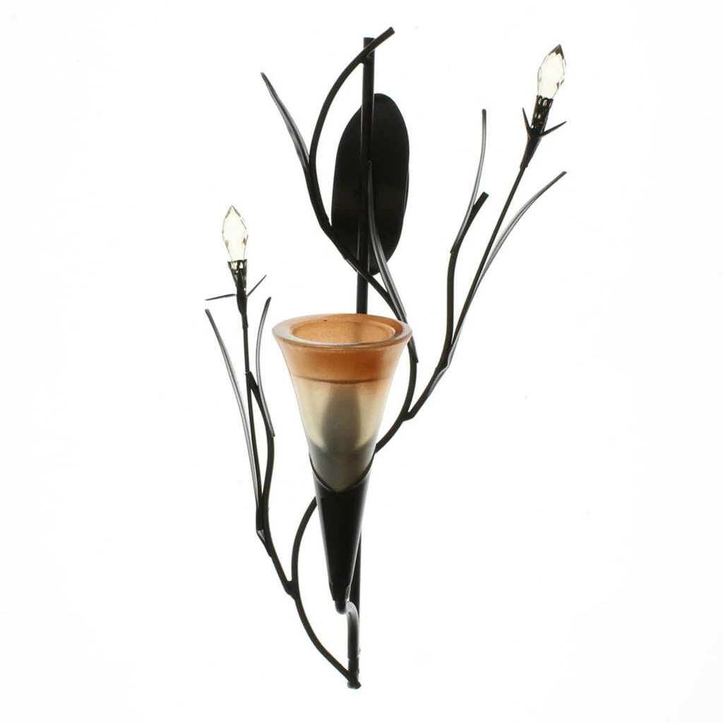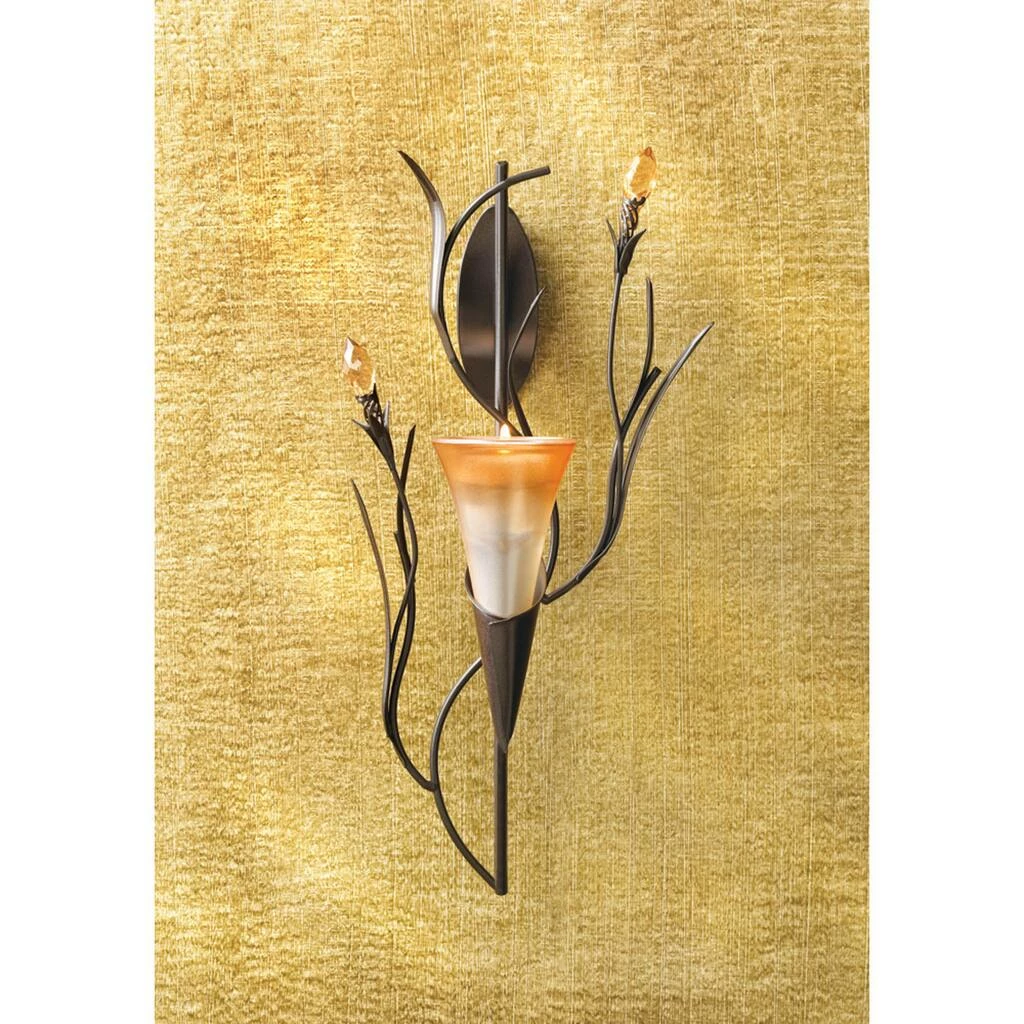 A delicate sunrise orange lily blossom, twining vines and crystalline buds makes for colorful wall decor. With the addition of your favorite tealight candle or LED, this wall sconce becomes a stunning combination of ornate sculpture and glowing light!