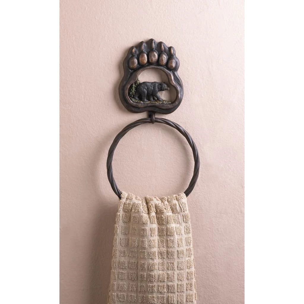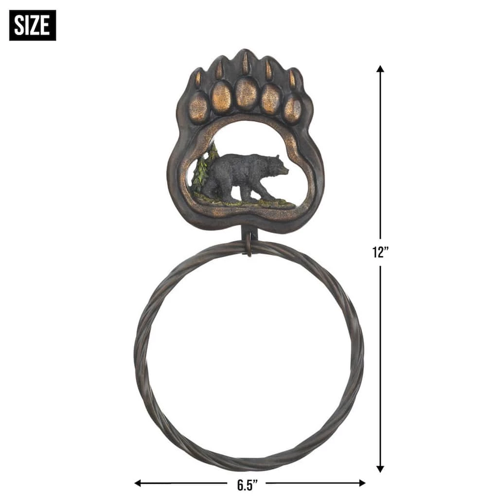 Bring the spirit of the wild into your home in style with this handsome towel ring. A large bear paw ornament at the top features a wooded scene and a majestic black bear on the move with a circular rope of iron that’s the perfect perch for a hand towel.
