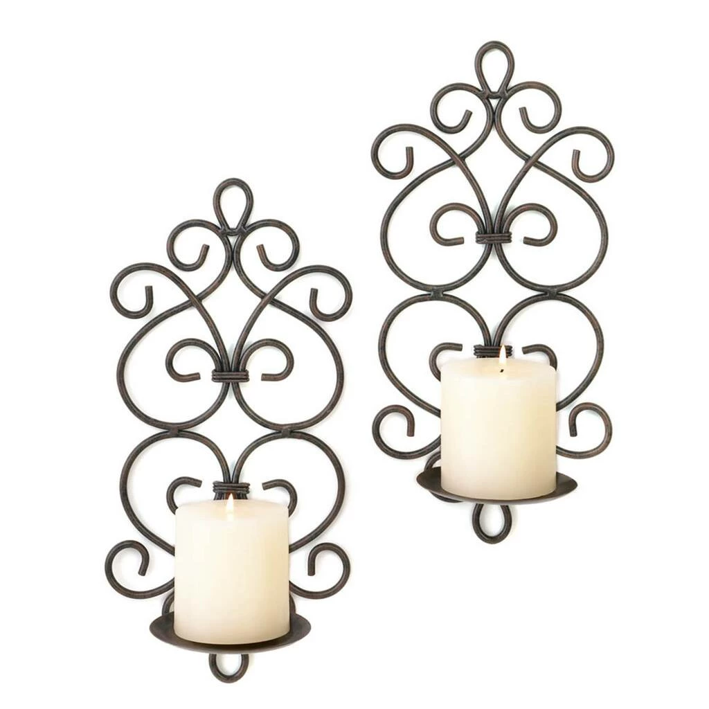These sconces create a uniquely ornate home embellishment that is both beautiful and functional. Two scrollwork metal candle sconces feature swirling metal wire designs and pedestals to create a flickering display of light.Β