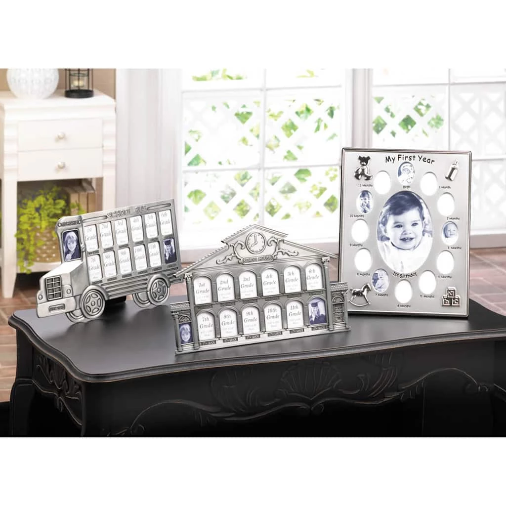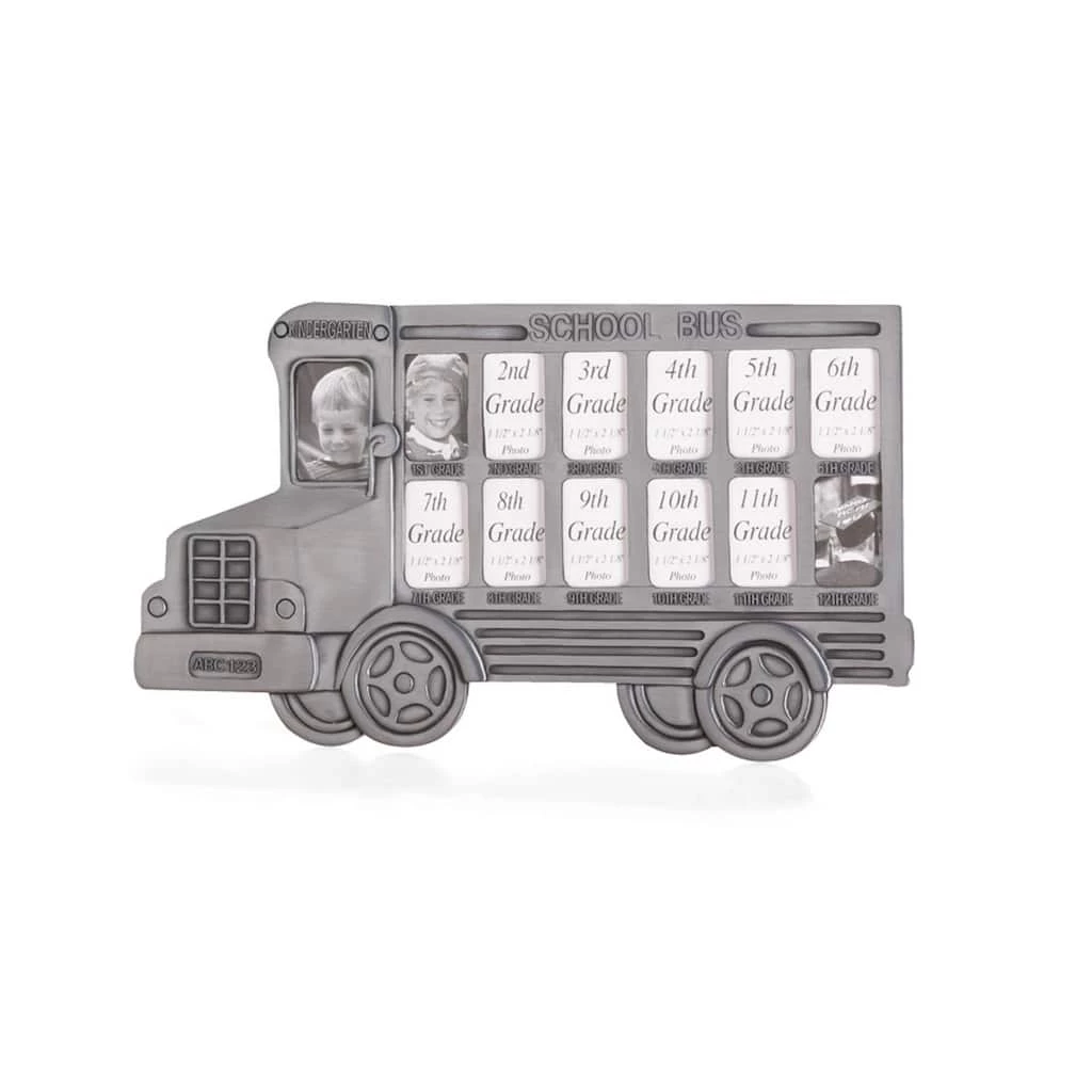 Made of metal and glass to protect and display your favorite memories. Display your child’s growth with this stylish and functional photo frame! Perfect as bedroom, living room, kitchen, or hallway dΓ©cor, this frame will look amazing while simultaneously capturing your child’s school journey. To clean your cherished frame, dust lightly or wipe with damp cloth as needed. This pewter-finish school bus has enough windows to frame all of your child’s wallet-sized class photos from grades Kβ12. A charming way to remember all theirΒ school days and features an easel back for easy display.