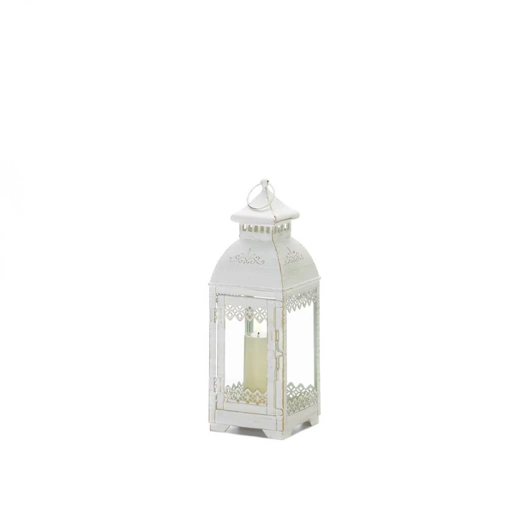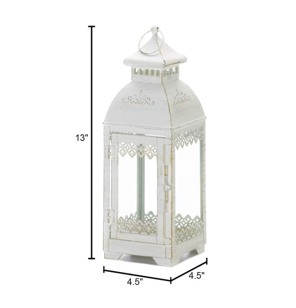 Made from durable iron and glass with a weathered faΓ§ade and lace detailing to enhance the candle’s flickering light. The decorative lantern features an iron frame in an antique-white finish with gorgeous white lace detailing. Perfect for farmhouse chic or French country decors, place your choice of candle or LED lighting inside the lantern with the easy to open front glass panels. Whether placed or hung, this lantern will illuminate your space in a stylish glow. Wipe with a dry/damp cloth or dust lightly to upkeep its splendid faΓ§ade. The decorative lantern features an iron frame in an antique-white finish with gorgeous white lace detailing. Perfect for farmhouse chic or French country dΓ©cors, place your choice of candle or LED lighting inside the lantern with the easy to open front glass panels. Whether placed or hung, this lantern will illuminate your space in a stylish glow.