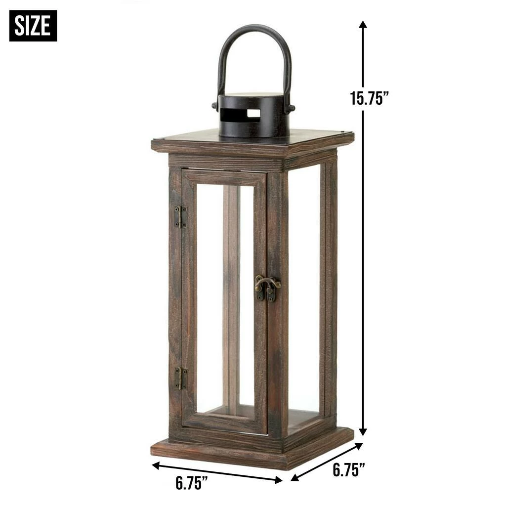 Either hanging or stationary, this lantern will cast beautiful light wherever you display it! Removable glass and wood panel allows the easy replacement of your choice of candle or LED to light up the space and create a memorable home dΓ©cor piece. The elongated glass panels let the light from your candle shine bright. This lantern looks great on your tabletop or hanging from its sturdy top loop. This inspired lighting accent features a stained wood framework, a fascinating top loop for hanging, and a vintage-inspired metal door latch.