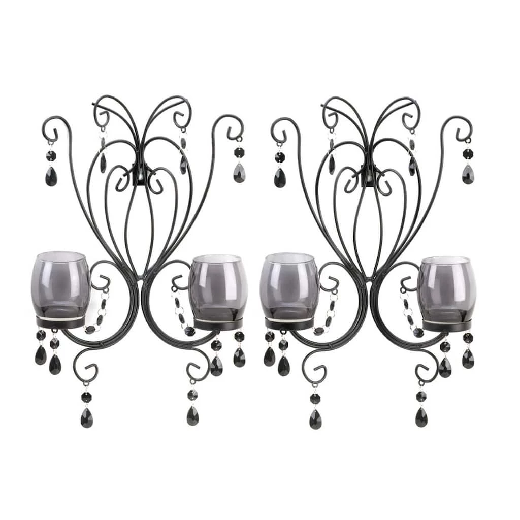 Dark and mysterious, this pair of wall sconces will turn candlelight into a dramatic lighting accent with two smoked glass candle cups set in a scrolling black metal frame.