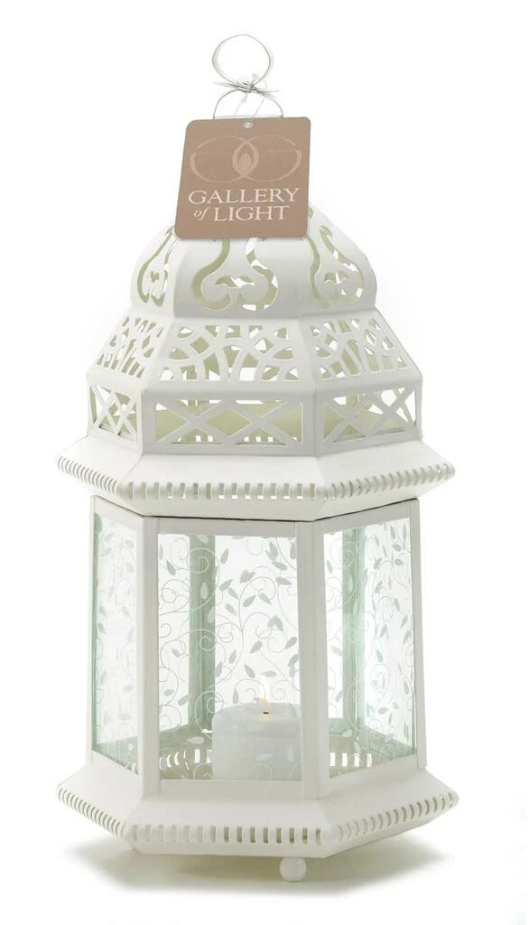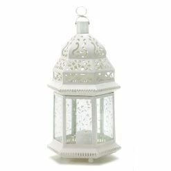 Made from durable iron and glass with decorative cutouts to enhance the candle’s flickering light. Either hanging or stationary, this Moroccan style candle lantern casts gorgeous light on any table spread and provides a warm glow on brisk nights. Its decorative metal top and etched glass lend an exotic flair to any home. Wipe with a dry/damp cloth or dust lightly to upkeep its splendid faΓ§ade. This lantern is a beautiful housewarming gift or personal dΓ©cor that lights up any space. Glass panel is easily opened to allow for new candles or LED lights to be placed inside and casts a flickering glow on summer and winter events alike.