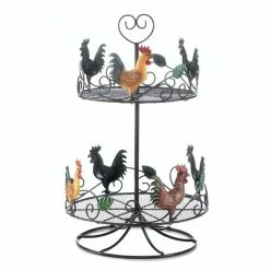 The possibilities are endless when you have this charming rooster circular rack on your kitchen counter. Fill it with spices or anything you want organized and looking neat. Itβs made from iron and the lower rack is wider than the top. Youβll love the colorful roosters and pretty flourishes.