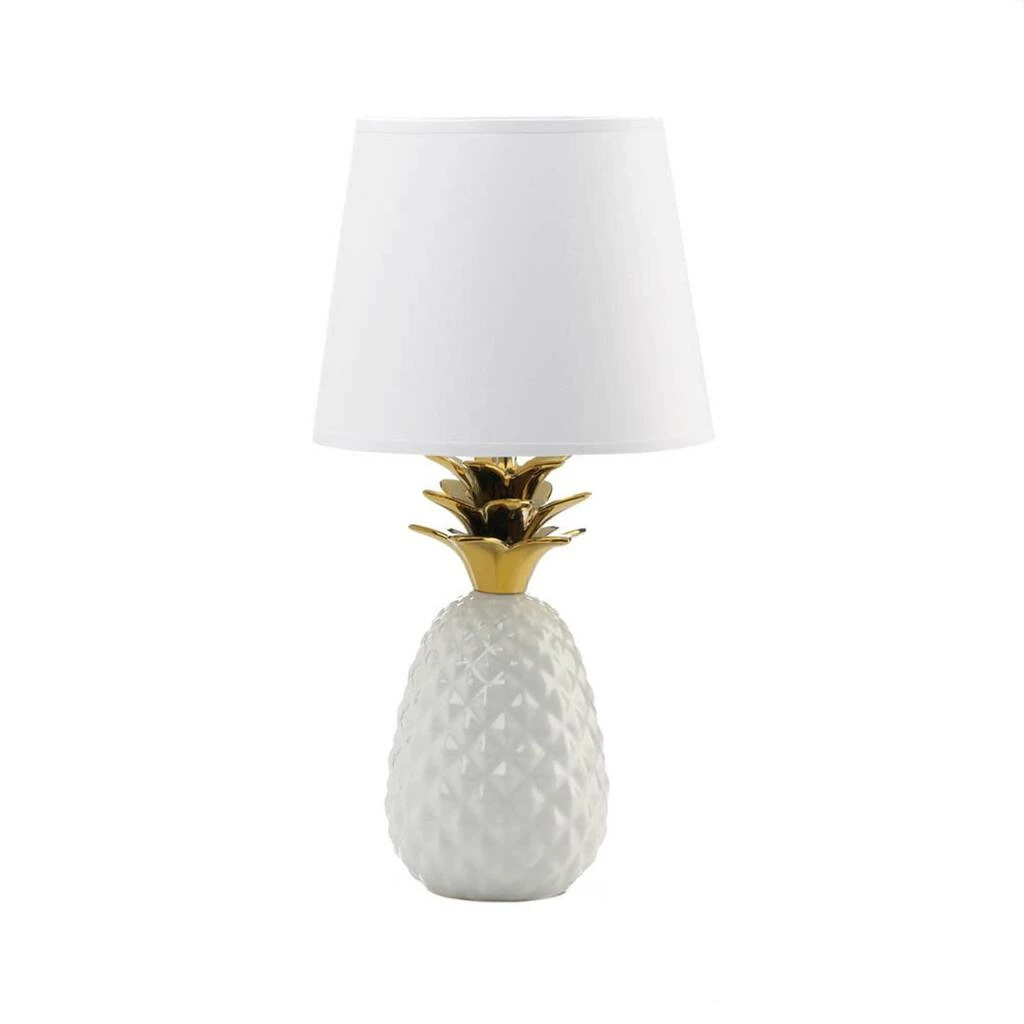 This beautifully crafted lamp made of porcelain, polyester, and cotton is both durable and stunning. This lamp can be used as side table lighting, office dΓ©cor, or as bedroom ambience. Both functional and stylish, this lamp will cast a beautiful glow wherever you display it. To clean your lighting dΓ©cor dust lightly or wipe with a damp cloth as needed. Turn your home into a tropical paradise with this fruity lamp! The gold spiked leaves add an eye catching appeal to the detailed pineapple base.