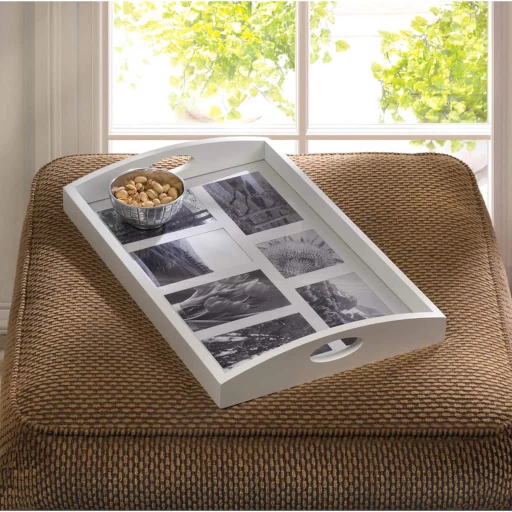This gorgeous tray is the perfect combination of style and storage. Great as a hallway embellishment, functional bathroom dΓ©cor, or statement living room piece, this tray is both stunning and versatile. To clean your cherished frame, dust lightly or wipe with damp cloth as needed. Hereβs a great way to keep your tabletop organized or serve guests while showing off your best photos. This wooden tray is finished in white and features two easy-carry handle cutouts.Β