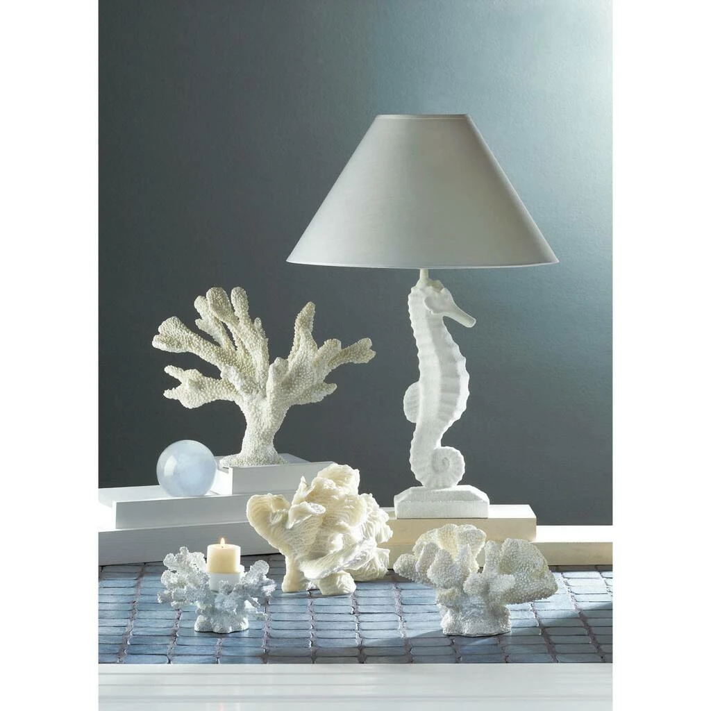 This beautifully crafted lamp made of polyresin and fabric is both durable and stunning. This lamp can be used as side table lighting, office dΓ©cor, or as bedroom ambience. Both functional and stylish, this lamp will cast a beautiful glow wherever you display it. To clean your lighting dΓ©cor dust lightly or wipe with a damp cloth as needed. Turn your home into a beach house with this seaside themed lamp! The base is shaped like a charming whiteΒ seahorse topped with a neutral fabric shade that will add a nautical flair to any home.