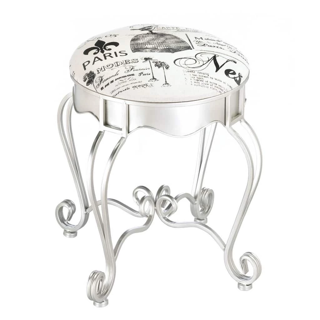 Add a dash of European style to your room with this functional and fashionable foot stool. The metal base features pretty flourishes, and the canvas covered cushion is printed with Parisian style. The stool is made of iron, canvas, and sponge to create a sturdy and decorative home dΓ©cor piece. Both functional and decorative, this stool will be a gorgeous piece for your home. Use as a comfortable footrest, stylish side table, or decorative accent to elevate your interior design! To clean the stool dust lightly or wipe with damp cloth as needed.