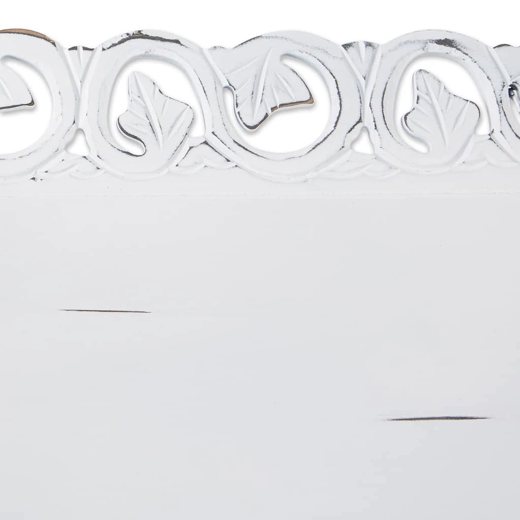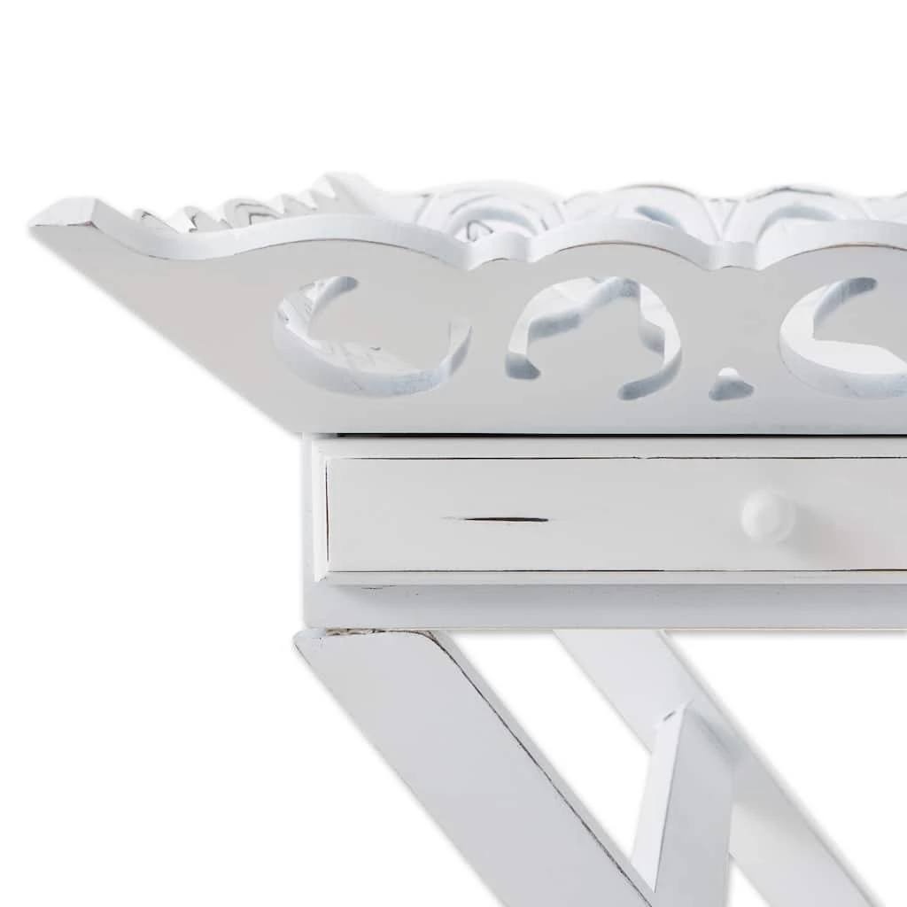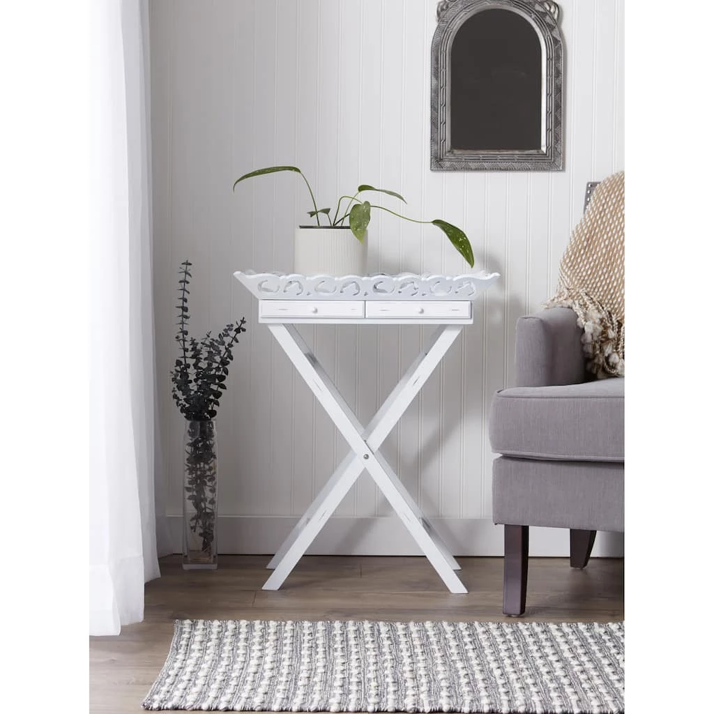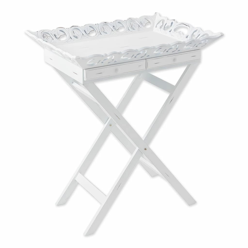 This gorgeous tray stand is the perfect combination of style and storage. Great as a hallway embellishment, functional bathroom dΓ©cor, or statement living room piece, this tray stand is both stunning and versatile. To clean your lovely tray, dust lightly or wipe with damp cloth as needed. Gracious entertaining is a snap with this stylish tray table! Elegantly aged white finish with a carved rim and two handy drawers; folding legs for easy storage.