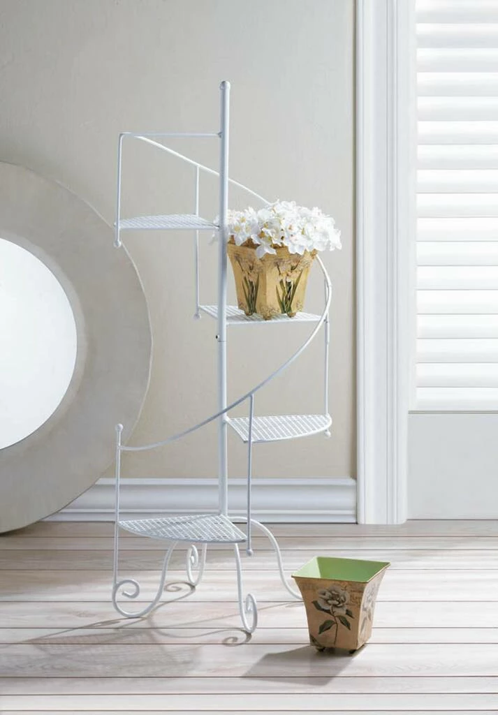 This plant stand is perfect for holding your favorite potted plants or trinkets of any kind, both indoors and outdoors. Place in a sunroom, patio, deck, or porch to add stylish home dΓ©cor and greenery to your space. To clean your plant dΓ©cor, wipe with a damp cloth as needed. Give four of your favorite plants a supremely stylish showcase! This iron plant stand features four mesh platforms, a curved ‘banister’ and four scrolling feet below, and it’s all covered in a pretty white finish. Standing at more than three feet tall, it’s a grand way to exhibit your green thumb.