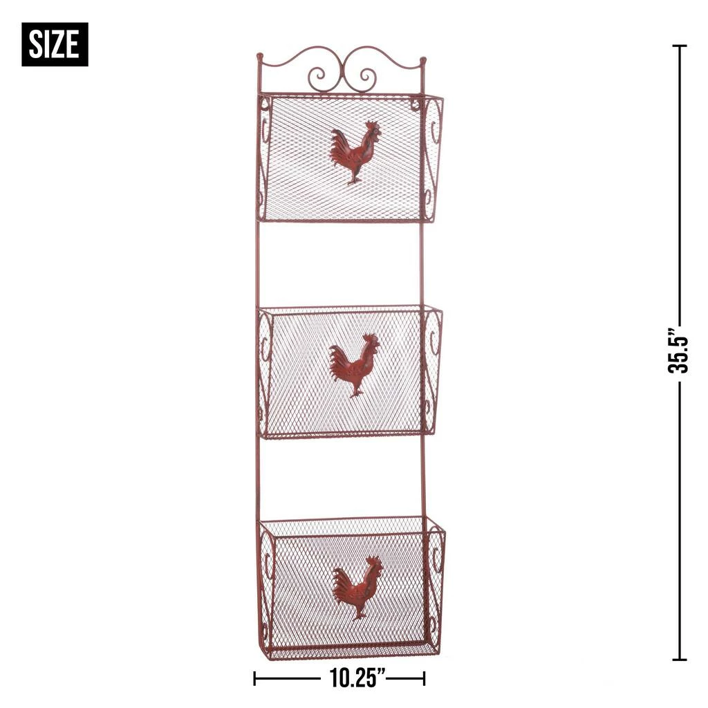 Featuring red metal roosters affixed to each basket, this farmhouse chic wall décor will also help you stay organized. Place in your home office, by the entryway, or near the kitchen to keep track of your outgoing mail, coupons, bills, or school folders. The attractive basket holder will look great on your wall paired with traditional, rustic, or country décor.