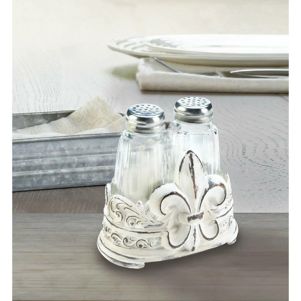 With a fleur-de-lis decoration adorned on the side of this salt and pepper shaker holder, this set is perfect for display on your dining room table. This lovely set offers effortless elegance and elevated appeal to any tabletop.