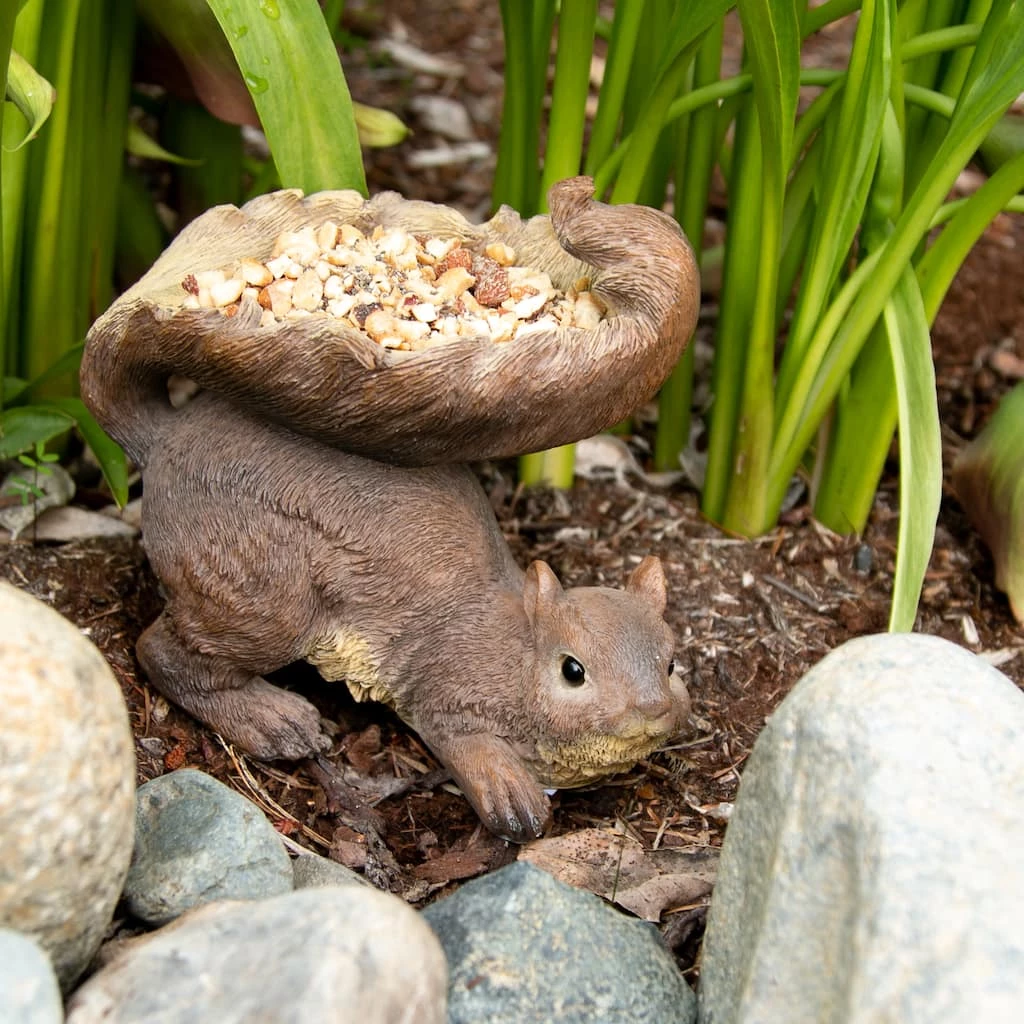 This lifelike feeder is a lovable outdoor accent with the squirrel sharing his bounty with his feathered pals, cupping a generous serving of birdseed in his fluffy tail. The bird feeder is made of polyresin to create a safe place for birds to snack. To clean your bird feeder, dust lightly or wipe with a damp cloth as needed.
