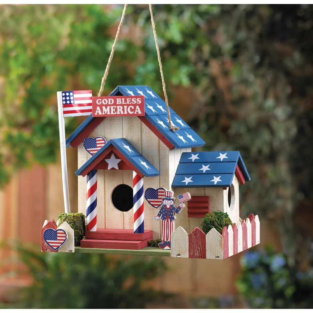 The birdhouse is perfect for a pair of nesting birds! Made from Eucalyptus wood to create a sturdy and decorative home for your feathered friends. Uncle Sam is ready to welcome some feathered friends to your yard! This darling birdhouse is filled with patriotic charm, featuring an American flag flying high from the flag pole, stars on the roof, and a red and white picket fence. Two entrances and heart-shaped decorations will make your birds feel right at home in the U.S.A! Either hung from it’s loop or rested on an elevated surface outside, this birdhouse provides a quirky and cozy home for local birds as well as amusing and enjoyable home dΓ©cor for yourself.