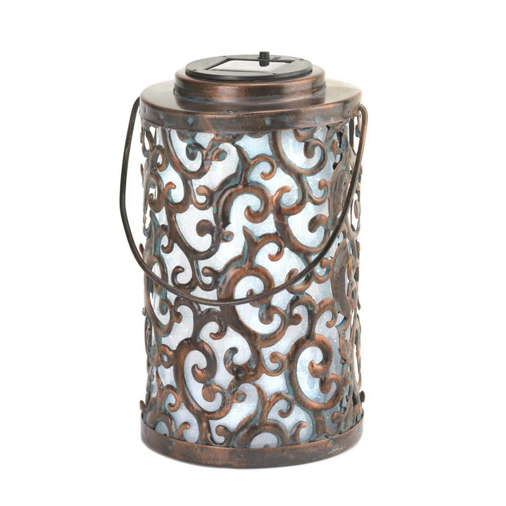 Either hanging or stationary, this lantern will cast beautiful light wherever you display it! Removable glass and wood panel allows the easy replacement of your choice of candle or LED to light up the space and create a memorable home dΓ©cor piece. To clean your lighting dΓ©cor, dust lightly or wipe with a damp cloth as needed. The gorgeous iron swirls and flourishes make this solar-powered lantern a beautiful accent for any outdoor space. The built-in solar panel at top will soak in the sun’s rays all day long, and by night the interior will glow with magical light.