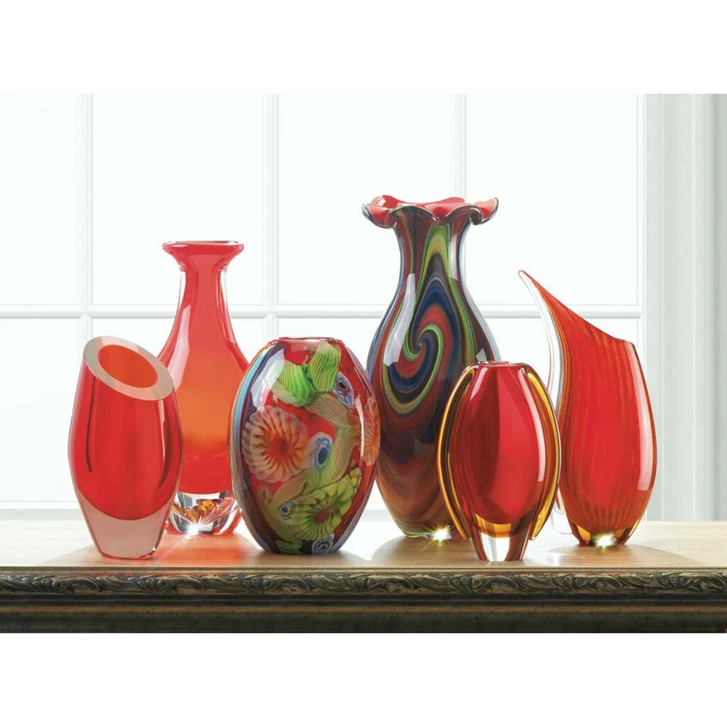 This vase weighs 5.2 lbs. and measures 5 inches by 5 inches by 9.5 inches. Made of glass to create a stunning home dΓ©cor accent. Accentuate your home’s side tables, bookshelves, mantels, or dressers with this exquisite decorative vase! Fill with flowers or leave as a stand alone dΓ©cor piece to elevate your interior design. To clean your work of art, dust lightly or wipe with damp cloth as needed. Dramatic design featuring an angled top and beautiful shades of red make this glass vase a stunning addition to your decor. Individually hand-crafted for its unique beauty and therefore may be slightly different from the picture shown here.