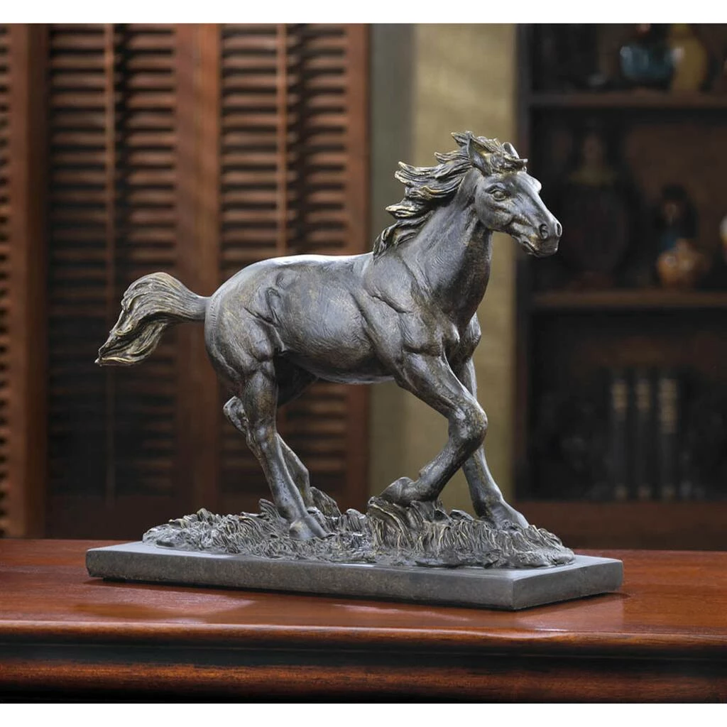 Class up your home with this exquisite statue! Place on your fireplace mantel, a shelf, or a tabletop surface to as a stylish and sophisticated display piece. To clean your statue, dust lightly or wipe with a damp cloth as needed. There is nothing like the grace and strength of a running stallion. Captured in mid stride in a meadow, this bronze colored beauty will be perfect rustic addition in any room.
