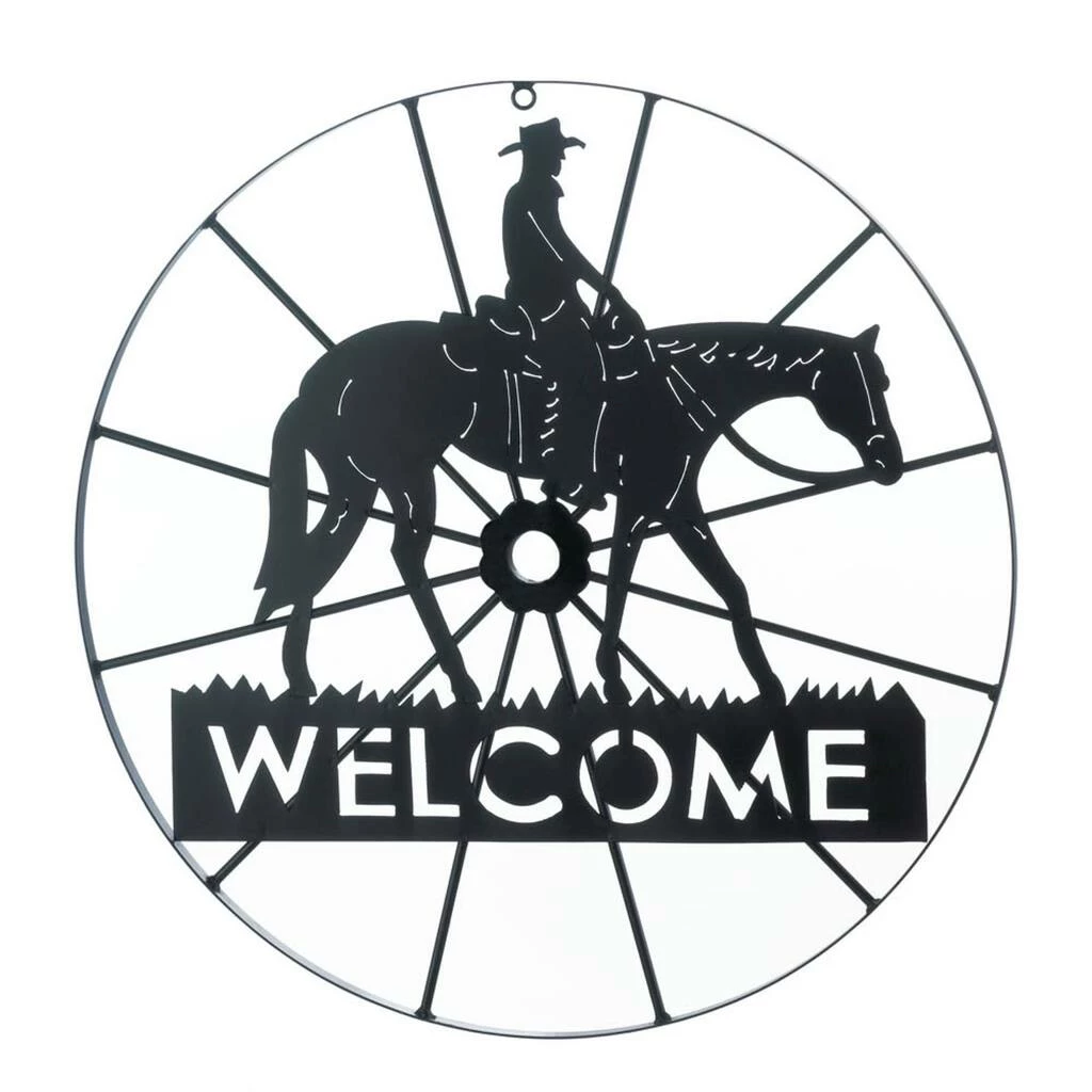 Welcome your guests into your home with this Western-inspired sign. This ranch-ready wall dΓ©cor features a wagon wheel design, silhouettes of a cowboy upon his trusty steed, and the word “welcome” in the grass below the horse’s hooves.