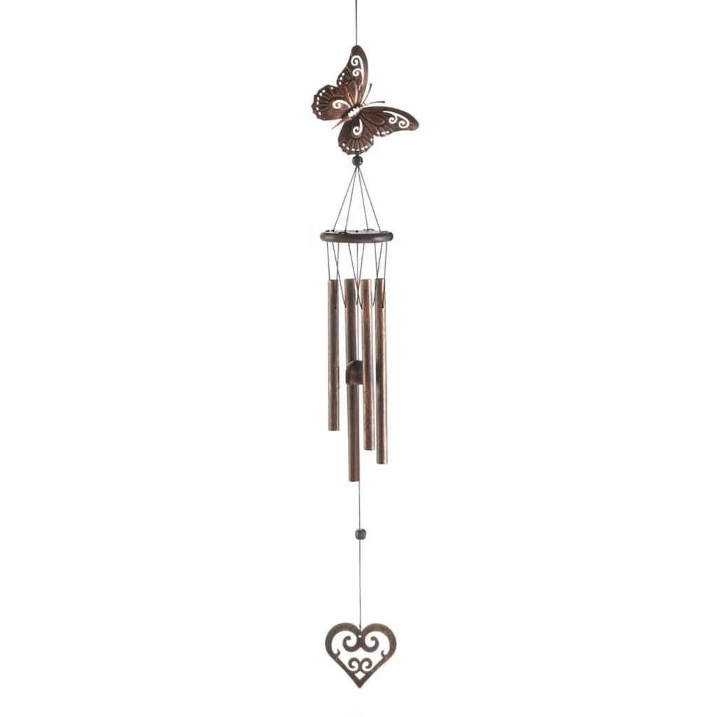 Hang anywhere including a patio, garden, front porch, or kitchen window to fill your home with natural music and gorgeous sculptural design. This wind chime will enhance any space with ambient noise and beautiful art! To clean your wind instrument, dust lightly or wipe with a damp cloth. This lovely wind chime will charm you, even when the breeze is still. It features a pretty butterfly on top and a decorative heart charm below. Hang it from your porch or patio and listen to the song of the wind!