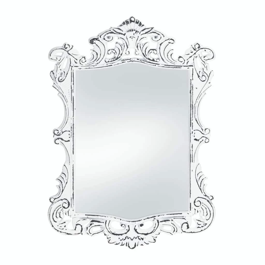 The elegant flourishes of this vintage-style rectangular mirror are highlighted by the timeworn white finish that shows off numerous curves. Bring a little royal style to your entry, powder room or above your vanity with this lovely accent. A great housewarming gift or personal home décor piece!