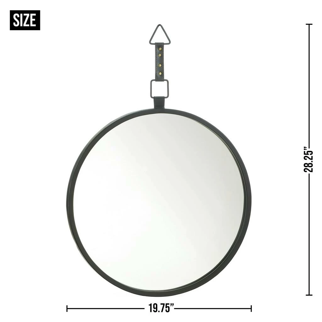 This round wall mirror includes a faux leather strap with iron hardware and a black frame for a modern industrial look. Hang this stylish mirror in your entryway or hallway to fill out the space with bold design elements. A great housewarming gift or personal home dΓ©cor piece!