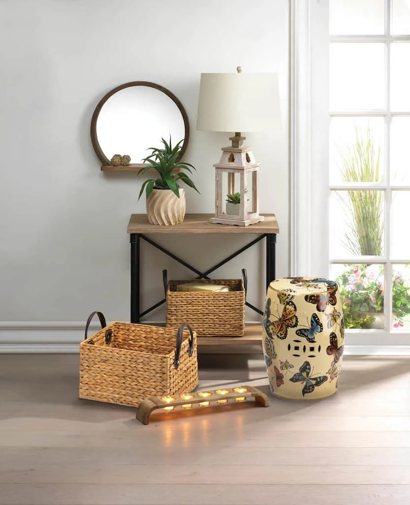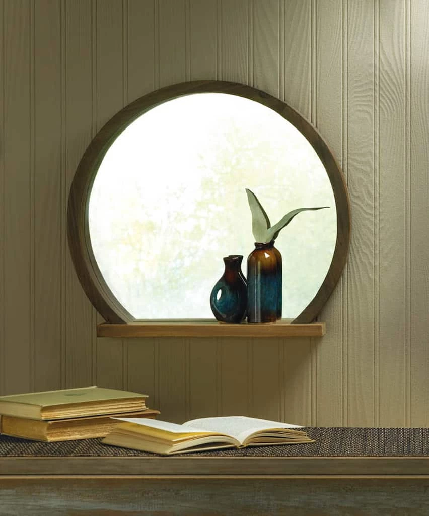 Add the finishing touch to your home dΓ©cor with this chic round wall mirror. Its unique two-tone wood design creates a rustic look that will blend beautifully with a country chic dΓ©cor. It also comes with a convenient shelf to store small items. A great housewarming gift or personal home dΓ©cor piece!
